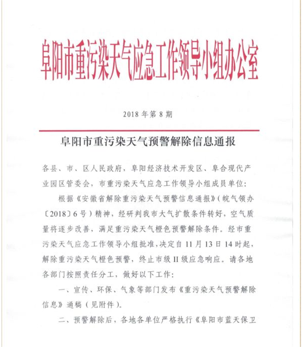 根据《安徽省解除重污染天气预警信息通报》(皖气领办〔2018〕6号)精神,经研判我市大气扩散条件转好,空气质量将逐步改善,满足重污染天气橙色预警解除条件。经市重污染天气应急工作领导小组批准,决定自11月13日14时起,解除重污染天气橙色预警,终止市级II级应急响应。