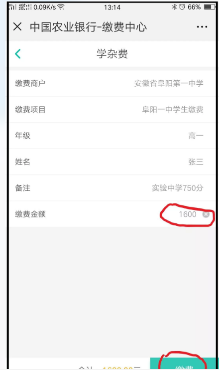 1、打开微信扫一扫,扫描(或长按识别)下方二维码进入农行缴费页面,先在“姓名”栏输入本人姓名(与学籍保持一致),再在“备注栏”输入“初中毕业学校+中考分数”(如:阜阳市实验中学780分),如下图:
