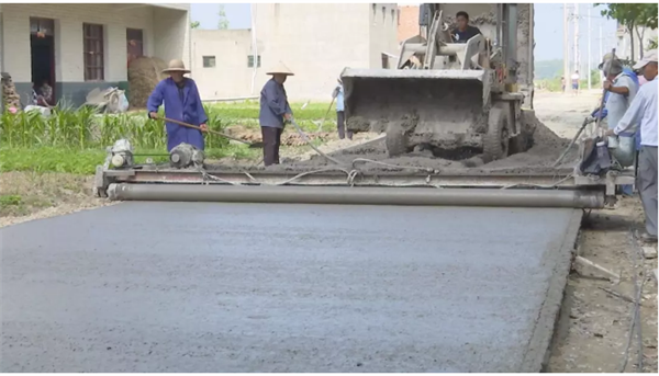 在界首市泉阳镇农村公路畅通工程混凝土搅拌站,一台大型铲车不停把砂石、水泥装进搅拌机里,两台大型搅拌机不停在运转,三轮车来回穿梭,把搅拌好的混凝土运到施工现场。经过打板、震压、抛光,一条平整光滑的水泥路